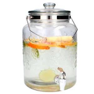 Ízléses 8 l-es üveg italadagoló, amely a cseppmentes fém csappal kényelmesen adagolja limonádét, jeges teát vagy koktélokat. A levehető üvegtető és a vintage dekoráció gondoskodik az italok frissességéről és a vendégek ámulatáról.