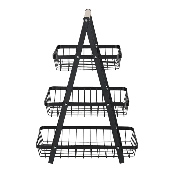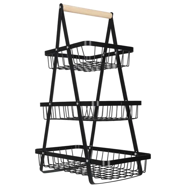 Háromszintes fekete fém-fa gyümölcs- és zöldségkosár, 34×17,5×48 cm