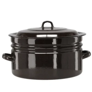 Ezzel a 25 literes, 40 cm átmérőjű, barna színű zománcozott fazékkal könnyedén elkészítheti a nagycsaládnak vagy rendezvényekre szánt ételeket. A dupla zománcréteg megóvja az acélfelületet a rozsdától és karcolásoktól, miközben esztétikus fényt biztosít hosszú távon.