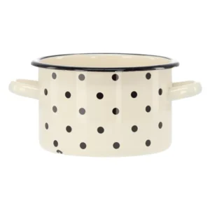 Klasszikus, fehér alapon pöttyös zománcozott lábas, amely 2 l űrtartalmának köszönhetően ideális levesekhez, mártásokhoz és kisebb adagok melegítéséhez. A zománcbevonat tartós, ellenáll a karcolásoknak, és nem veszi át az ételek ízét vagy szagát. Minden típusú tűzhelyen használható, indukción is, továbbá könnyen tisztítható, mert a sima felület nem engedi megtapadni az ételmaradékot.