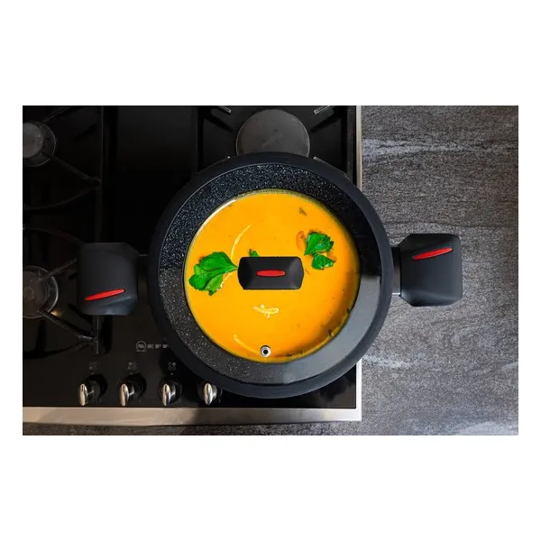 • Edzett üvegfedél gőzszellőzővel – A mellékelt törésálló üvegfedél lehetővé teszi az ételek figyelemmel kísérését a főzés során anélkül, hogy fel kellene emelni a fedelet. A beépített gőzszellőző segít szabályozni a nedvességszintet, megakadályozva a kifutást, miközben megőrzi az ízeket és a tápanyagokat.