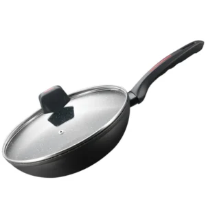 • Tartós Kovácsolt Alumínium Kialakítás – Kiváló minőségű alumíniumból készült, ez a wok serpenyő kiváló hőtartást és egyenletes hőeloszlást biztosít, megelőzve a forró pontokat. Masszív kialakítása biztosítja a hosszú távú teljesítményt a mindennapi főzéshez.