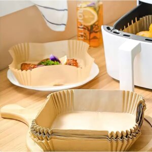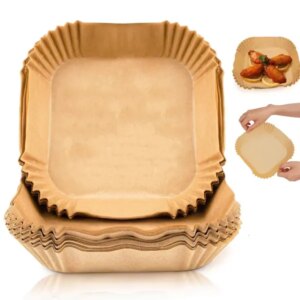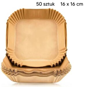 Papír légsütőhöz – 50 darabos készlet. A termék lehetővé teszi a készülék tisztán tartását. Megakadályozza az étel odaégését sütés közben. A betétek mikrohullámú sütőben, sütőben és más készülékekben is használhatók. A papír víz- és olajálló, így nem tapad a légsütő felületéhez.