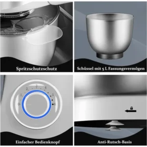 • Sokoldalú tartozékok: dagasztókar, lapát, habverő, szilikon kaparó és fröccsenésgátló fedél adagolónyílással.