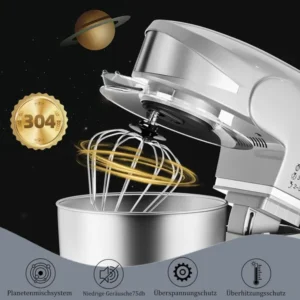 1600 W-os, planetáris álló mixer 6 l inox tállal és 6 sebességgel; tökéletes kenyérhez, tortához és habokhoz. Stílusos ezüst kivitel, gyors tisztítás.