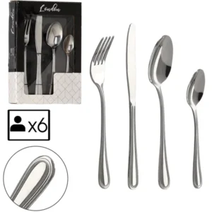 • A készlet tartalma: 6 db kés, 6 db villa, 6 db evőkanál és 6 db teáskanál – összesen 24 darab.