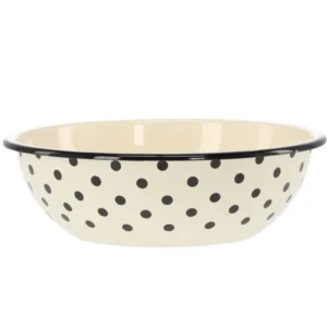 2,5 literes, 24,5 cm átmérőjű zománcozott tál tökéletes választás keveréshez, tálaláshoz és tároláshoz. A klasszikus, fehér pöttyös mintázat vidám hangulatot visz a konyhába, a tartós acélmagot fedő zománcréteg pedig ellenáll a rozsdának és a karcolásoknak.