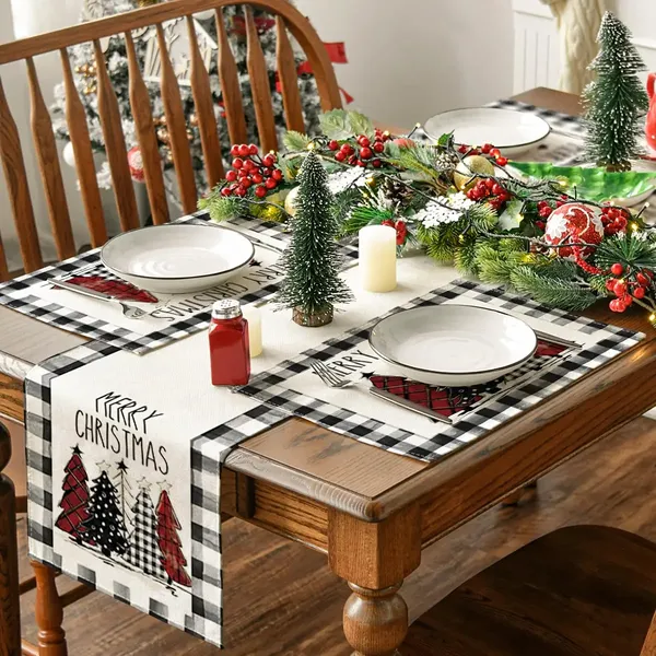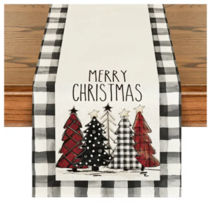 Varázsolj meghitt, ünnepi hangulatot az étkezőbe ezzel a fekete–fehér kockás, színes karácsonyfákkal és „Merry Christmas” felirattal díszített asztali futóval. A strapabíró poliészter anyag folttaszító, könnyen tisztítható, így a karácsonyi készülődés során sem kell a foltok miatt aggódnod.