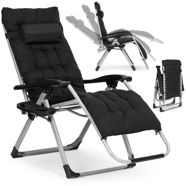 • Összecsukható kerti napozóágy párnával, fejtámasszal és tálcával, fekete