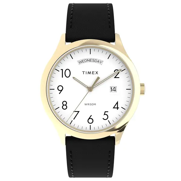 • Timex Modern Easy Reader férfi karóra, fehér számlap, fekete bőrszíj, arany tok, dátum+napszámláló