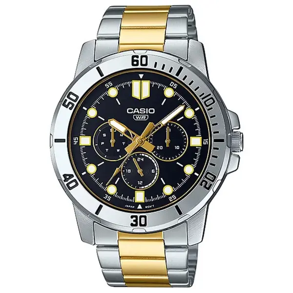 • Casio férfi karóra MTP-VD300SG-1E, ezüst–arany acél, fekete számlap, dátum, WR30
