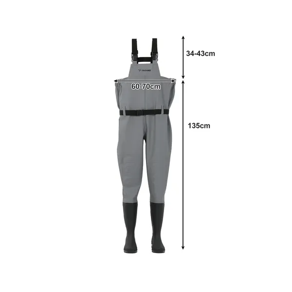 100 % vízálló PVC mellcsizma csúszásgátló gumitalppal, amely egész évben szárazon tart és stabil lépést biztosít; állítható vállpántjai és deréköve révén vastag aláöltözetre is kényelmesen felhúzható.
