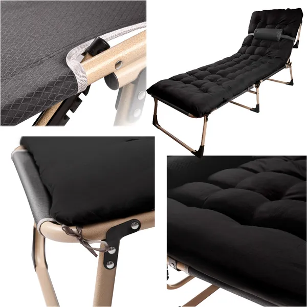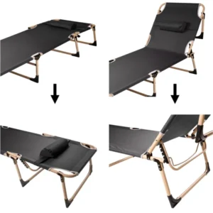 Az összecsukható kempingágy masszív acél vázával és 4 fokozatban dönthető fejtámaszával kényelmes alvóhelyet kínál otthon és útközben is. Kompakt mérete és két mellékelt párnája révén könnyen szállítható, mégis 120 kg teherbírást biztosít.