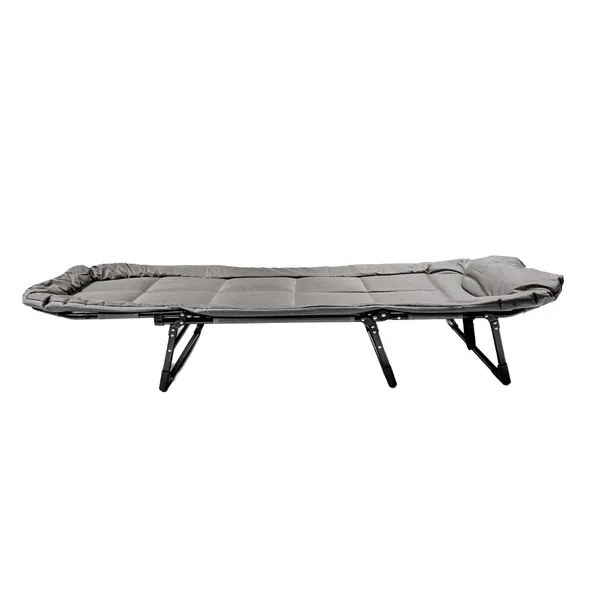 A megerősített acélváz 100 kg teherbírást nyújt, az 5 fokozatban állítható fejtámasz pedig olvasáshoz, napozáshoz és alváshoz is ideális szöget kínál. A légáteresztő poliészter huzat és a derékrésznél elhelyezett rugalmas feszítőpánt ergonomikus alátámasztást ad még meleg nyári éjszakákon is.