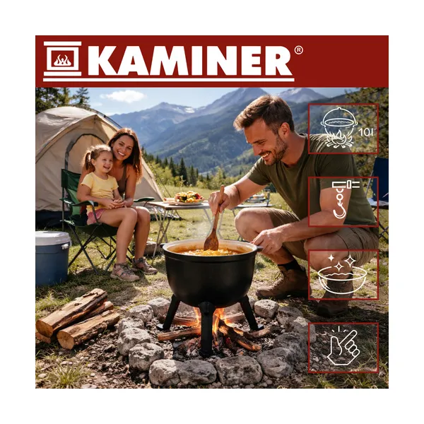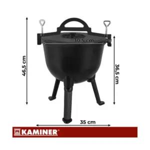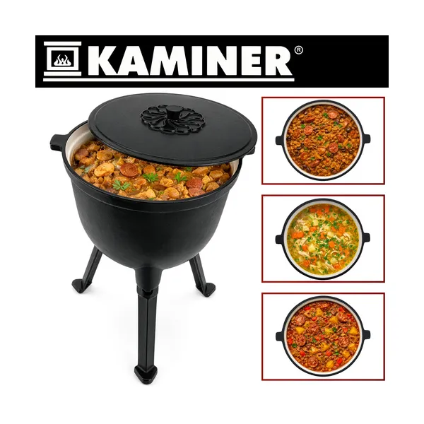 A zománcozott belső felületű öntöttvas bogrács egyenletes hőeloszlást és könnyebb tisztítást kínál, így kényelmesen készíthet nagy adag egytálételeket szabadtéren. A 10 literes űrtartalom, a fedő és a levehető lábak praktikus megoldást adnak kerti főzésekhez és családi összejövetelekhez.