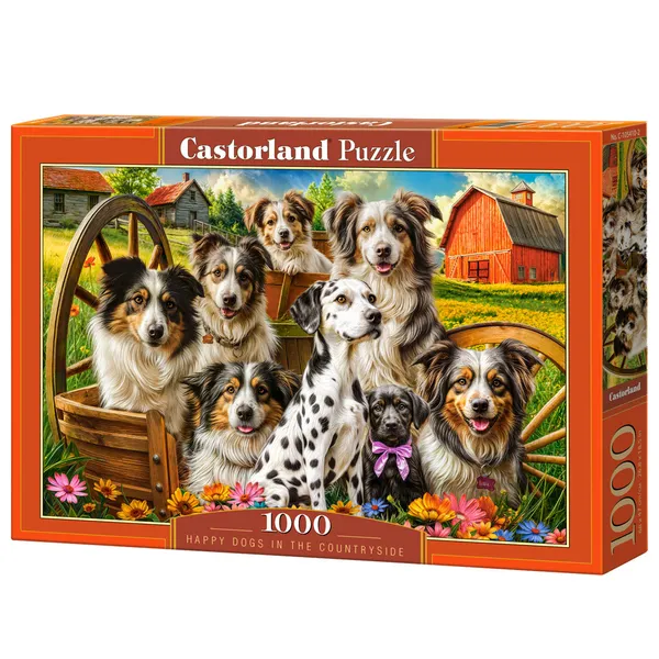 A 1000 darabos puzzle élénk, kutyás vidéki jelenete nemcsak pihentet, hanem fejleszti a koncentrációt és a türelmet is. Precíz illeszkedésének és tartós kartonjának köszönhetően a kész kép akár falra is kerülhet.