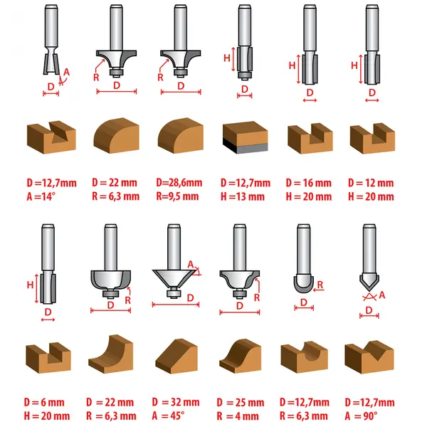 12 darabos gyorsacél (HSS) asztalos profilmaró készlet fa megmunkálásához, praktikus fa dobozban. Különböző formájú marófejekkel ideális élek, hornyok és díszítő profilok kialakítására.