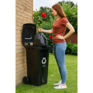 A 120 literes fekete vegyeshulladék-kuka ideális családi házakba, irodákba és szolgáltatóhelyekre.