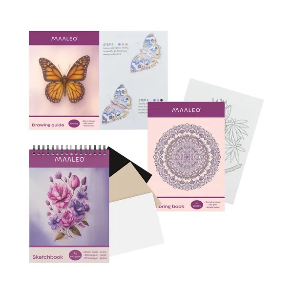 Azonnal használható, 120 színű színesceruza-szett puha béllel a sima satírozáshoz és szép színátmenetekhez, rendezett cipzáras tokban. A vázlatfüzet, színező és rajztanuló füzet segít ötletet találni és gyorsabban fejlődni otthon, iskolában vagy útközben.