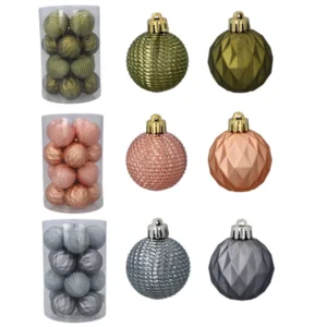 A 16 darabos gömbsor modern, olíva–réz–grafit árnyalataival egységes, mégis változatos textúrát és mélységet ad a karácsonyfának, miközben finom, ünnepi fényt sugároz. Könnyű műanyag kivitelének, arany akasztófüleinek és praktikus, átlátszó tubusának köszönhetően pillanatok alatt felrakható, biztonságosan tárolható, így évekig megőrzi elegáns csillogását.