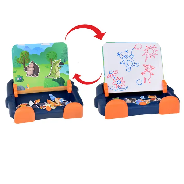 A 2 az 1-ben mágneses tábla egyszerre kirakó és filccel használható rajzfelület: a gyermek a mellékelt mágneses állatdarabokból összeállíthatja a mintákat, vagy saját fantáziája szerint alkothat. A kedves, hordozható csomagolásnak köszönhetően ideális utazáshoz, autóba, iskolába vagy bármilyen várakozós helyzethez.