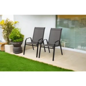 A porfestett acélvázból készült, mégis könnyű székpár ideális választás teraszra, erkélyre vagy kertbe. A szellős, strapabíró Textilene 2×1 kárpit és a gondosan méretezett háttámla hosszan tartó kényelmet nyújt, miközben a fekete–szürke színvilág modern megjelenést biztosít.