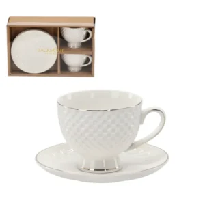 Elegáns, dombornyomott csésze- és csészealj szett arany díszcsíkkal, amely feldobja a reggeli kávét és a vendégvárást. Praktikus űrtartalmával és kifinomult megjelenésével tökéletes ajándék, illetve stílusos kiegészítője bármely otthoni konyhának.