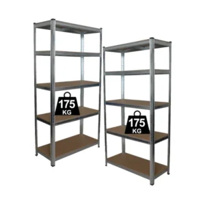 Valódi raktári teherbírással rendelkező, 2 darab 5 polcos állvány szett, amely ideális garázsba, pincébe vagy irodai irattárba. A horganyzott acél profilok és az 5 db, HDF lapból készült polc polcanként 175 kg, összesen akár 875 kg terhelést bír el egy állványon, egyenletes tehereloszlás mellett.