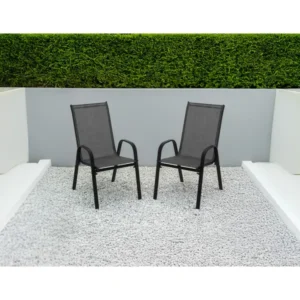Az időjárásálló porszórt acél váz és a légáteresztő textilén ülőfelület hosszú távú komfortot garantál még forró nyári napokon is, legyen szó családi étkezésről vagy pihentető olvasásról. Használaton kívül a székek egymásra rakhatók, így alig foglalnak helyet a teraszon vagy a tárolóban.