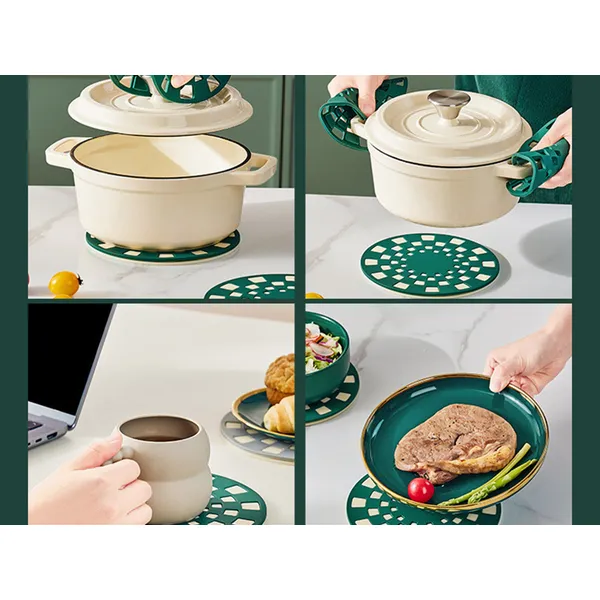 A két darabos, hőálló szilikon edényalátét nélkülözhetetlen segítőtárs minden konyhában: megóvja a munkapultot és az asztalt a forró lábasok, serpenyők, tepsik hőjétől, miközben modern, geometrikus megjelenésével stílusos kiegészítő.