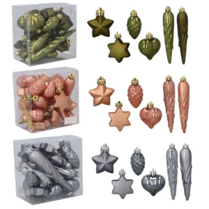 20 darab törhetetlen gömb modern olíva, rezes és grafit árnyalatban, matt, fényes és csillámos felületekkel, arany akasztózsinórral ellátva, praktikus tárolódobozban érkezik, amely megkönnyíti a szezon utáni rendszerezést. Könnyűek, tartósak, gyermek- és házikedvenc-barát kialakításuk elegáns, luxus hangulatot visz bármelyik karácsonyfára, és még évek múlva is újszerűen ragyognak.