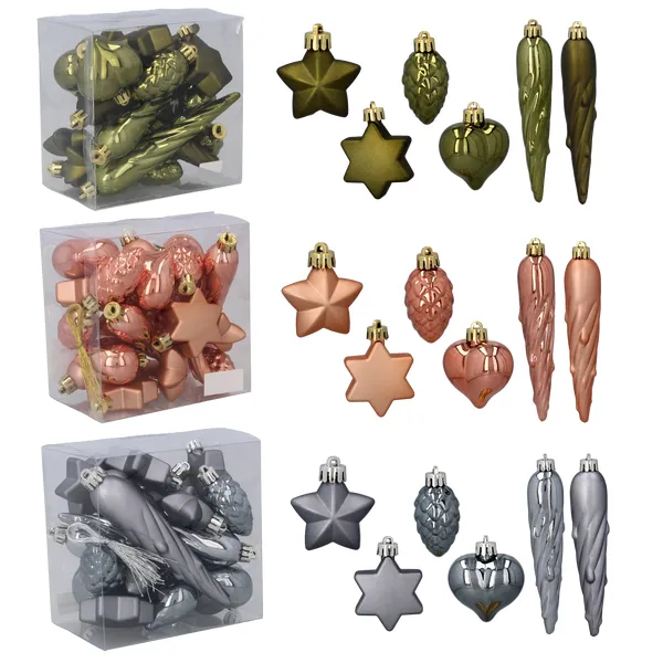 Magas minőségű 20 darabos karácsonyfadísz gömb szett, mely tökéletesen ötvözi az elegáns olívazöldet, a meleg rezes árnyalatot és a modern grafitszürkét. A változatos, matt, fényes és csillámos felületek izgalmas textúrát és extra csillogást kölcsönöznek a karácsonyfának.