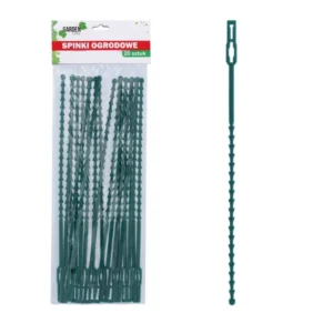 A 20 darabos, 22 cm hosszú kerti növényrögzítő csipesz készlet egyszerű és kíméletes megoldást kínál a hajtások karóhoz vagy más támasztékhoz való rögzítéséhez. A hajlékony, UV-álló zöld műanyag diszkréten simul a lombozathoz, így nem zavarja a kert természetes látványát.