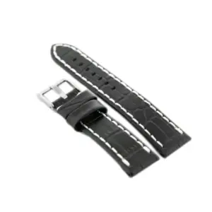 Természetes bőrből készült fekete óraszíj elegáns fehér varrással és ezüstszínű fémcsattal. Kényelmes viseletet biztosít, klasszikus megjelenésével pedig ideális választás a mindennapi használathoz és alkalmi öltözékhez is.