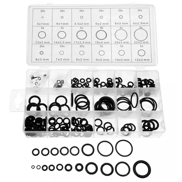 225 darabos, olajálló gumi O-gyűrű készlet 18 különböző méretben, praktikus rekeszes tárolódobozban. Ideális választás műhelybe, autószereléshez, karbantartási feladatokhoz és általános tömítési munkákhoz.