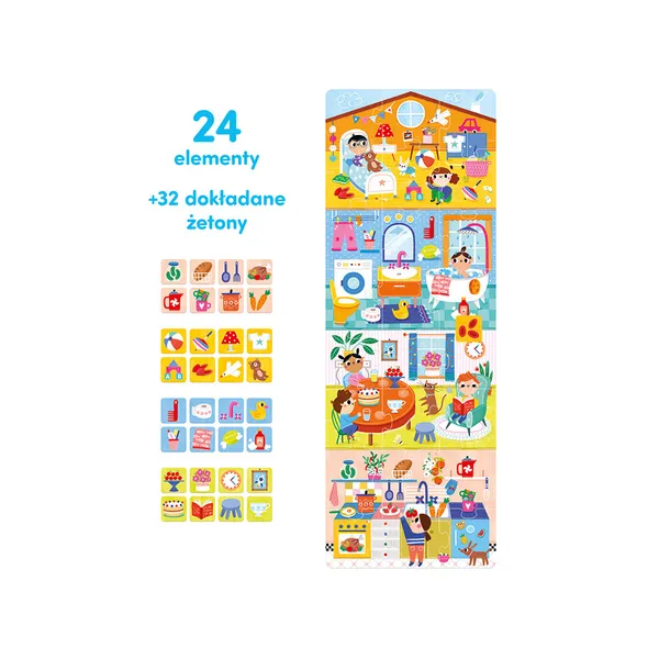 A 24 elemű puzzle és 32 kiegészítő lapka játékosan fejleszti a gyerekek szókincsét, koncentrációját és kézügyességét, miközben felfedezik a fürdőszoba, konyha, gyerekszoba és nappali világát.