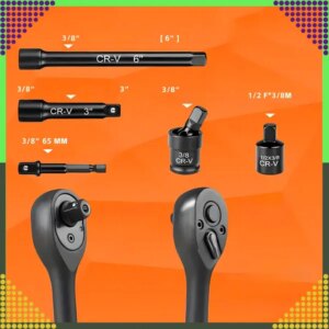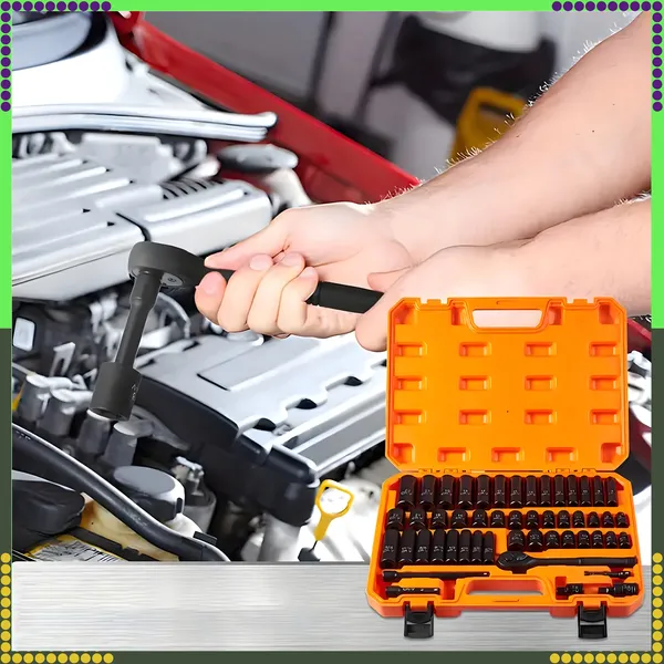 50 részes 3/8"-os ütvecsavarozó dugókulcs készlet Cr-V acélból, SAE és metrikus méretválasztékkal a sokoldalú, biztonságos csavarozásért. Racsnis hajtókar, hosszabbító és kardáncsukló segít a szűk helyeken, a masszív koffer pedig rendet tart és védi a szerszámokat.