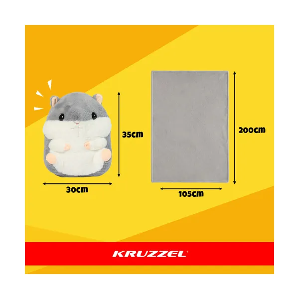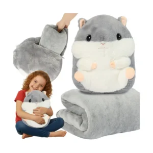 Aranyos, 3 az 1-ben hörcsög plüss: egyszerre plüssfigura, puha párna és meleg takaró. A takaró a hörcsög „pocakjában” rejtőzik, így pillanatok alatt elővehető és ugyanilyen gyorsan el is pakolható – rend és kényelem kompromisszumok nélkül. Otthon, utazáskor vagy délutáni szunyókáláshoz is ideális társ, amely biztonságérzetet ad a kicsiknek.