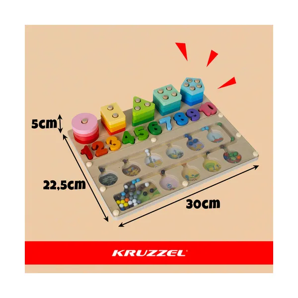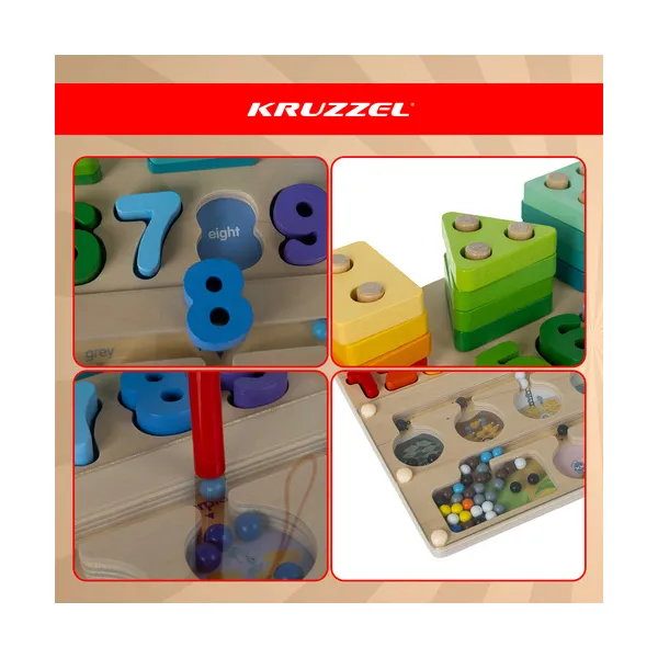 Képernyőmentes, nyugodt elfoglaltság, amely játék közben fejleszti a finommotorikát, a koncentrációt és a logikus gondolkodást. A kompakt, 3 az 1-ben fa tábla mágneses labirintussal, formákkal és számokkal utazáshoz is praktikus, kevesebb elkallódó darabbal.