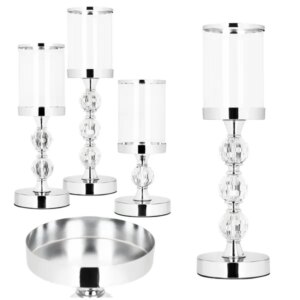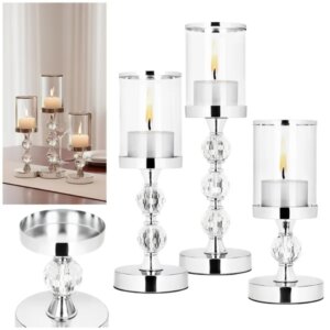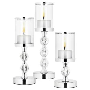 Három különböző magasságú, ezüst színű gyertyatartó elegáns ragyogást visz az asztalra, miközben az üvegbúra védi a lángot. Robusztus fém-üveg kialakítása tartós, a filc talp pedig óvja a bútorokat.