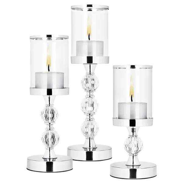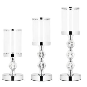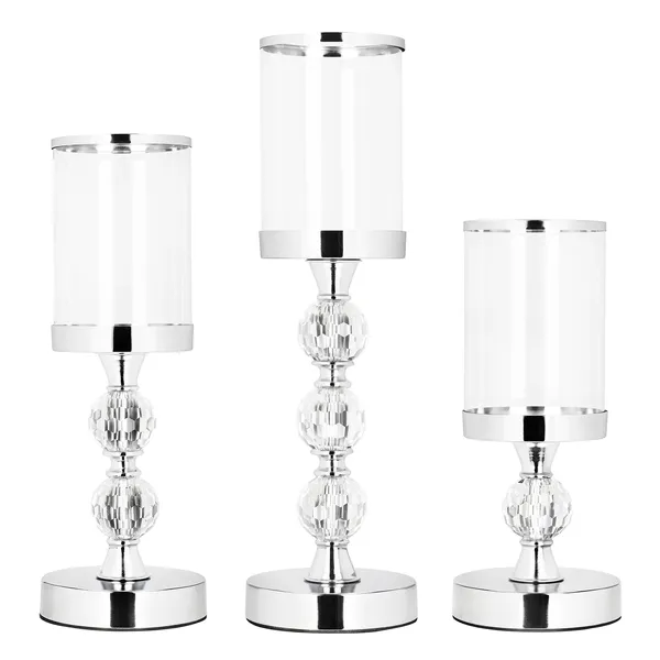 Dobd fel az ünnepi vagy hétköznapi asztaldekorációt ezzel a háromrészes gyertyatartó készlettel, amely a fém eleganciáját ötvözi a kristályhatású díszgömbbel és az átlátszó üveg hengerekkel.