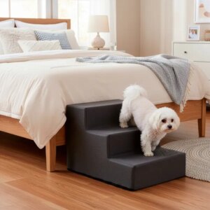 3 lépcsős kutyalépcső kényelmes segítség kedvencének a kanapéra, ágyra vagy autóba fel- és lejutáshoz. A nagy sűrűségű szivacs stabil alátámasztást ad, a csúszásmentes talp pedig biztonságosabb használatot támogat a mindennapokban.