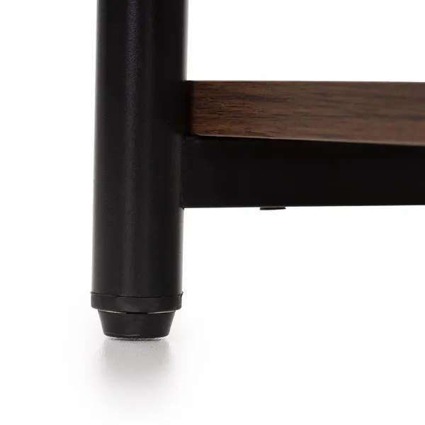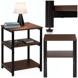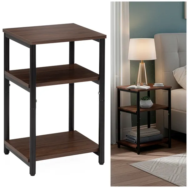 Stílusos és praktikus éjjeliszekrény, amely fém vázzal és forgácslap polcokkal stabil tárolóhelyet ad a hálószobában, nappaliban vagy előszobában. A sötétbarna–fekete színkombináció könnyen illeszkedik modern és loft enteriőrökbe.