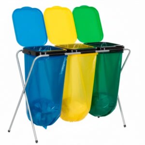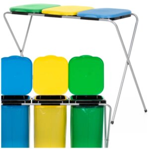 Háromrekeszes, fedeles állvány a szelektív hulladékgyűjtéshez: átlátható rendszerezést ad, és a színes fedők segítik a gyors szétválogatást. A csúszásgátló talpak stabilan tartják, a belső leszorító fül pedig a zsákot a helyén rögzíti a kényelmes, tiszta használatért.