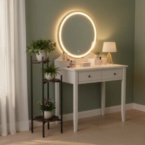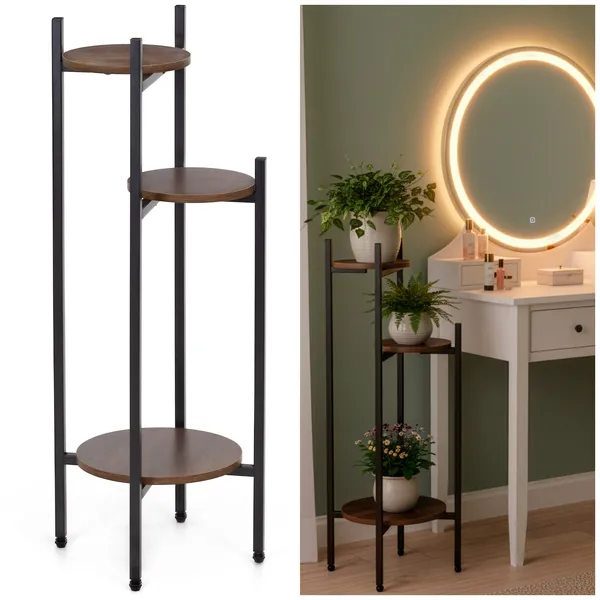 Stílusos, helytakarékos virágtartó állvány, amely 3 szinten rendezi növényeidet. A fém váz stabil tartást ad, az MDF polcok pedig esztétikus felületet biztosítanak cserepeknek és dekorációknak. Ideális nappaliba, erkélyre vagy előszobába.