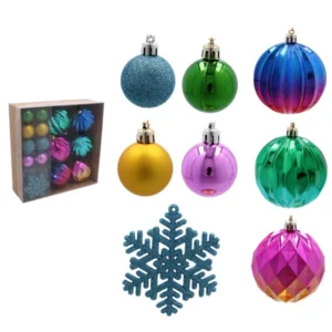 Fényes, matt és csillámos felületű, törhetetlen karácsonyfadísz szett, mely 30 darab vegyes színű elemmel varázsol ünnepi hangulatot, a gyárilag felszerelt akasztóknak köszönhetően pillanatok alatt.