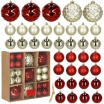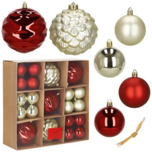 A 37 darabos, törhetetlen díszgömb szett változatos felületű piros, arany és gyöngyház gömböket kínál, hogy percek alatt ragyogóvá varázsold a fenyőt. Könnyű műanyagból készült, így biztonságos gyerekeknek, háziállatoknak, és nem terheli meg az ágakat.