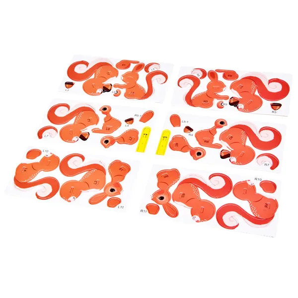 A perforált, színes kartonelemekből 35 darabot kell kinyomni és egymásba illeszteni, így ragasztó nélkül épül fel egy kedves vörös mókus figura, amely kb. 7×7,5×4 cm-es.