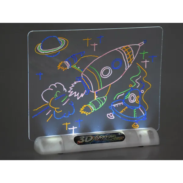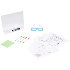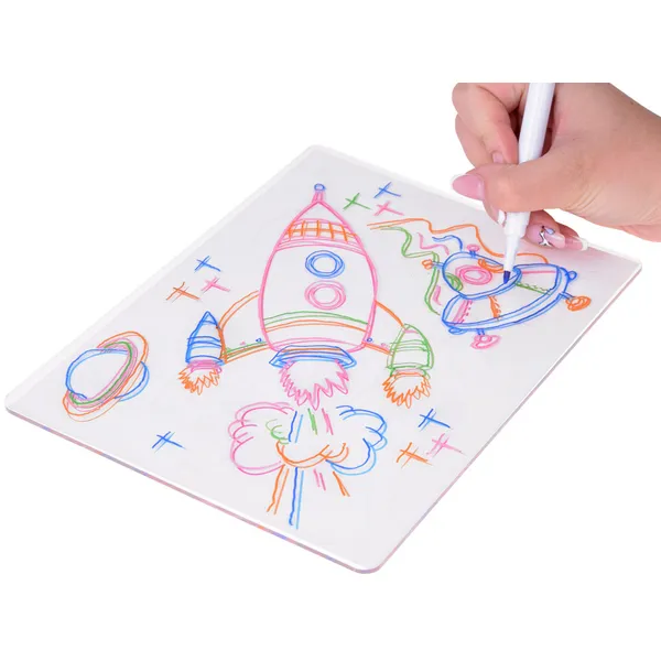 A 24,5×19 cm-es, LED-del megvilágított táblán fluoreszkáló filcekkel rajzolhat a gyermek, majd egy törlés után újrakezdheti. A csomagban található 3D szemüveg térhatásúvá teszi a képeket, így a kreatív élmény még izgalmasabb.