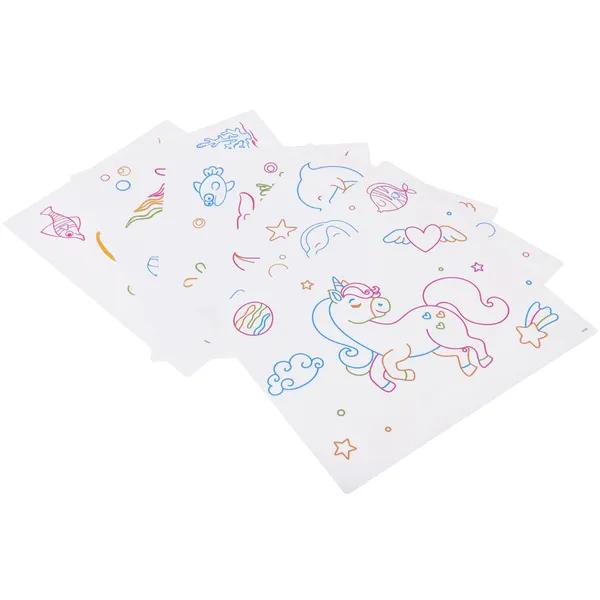 A 24,5×19 cm-es felület nedves ruhával egyszerűen letörölhető, így újra és újra használható, fejlesztve a kézügyességet, a színérzéket és a fantáziát. Ideális ajándék 3 éves kortól.